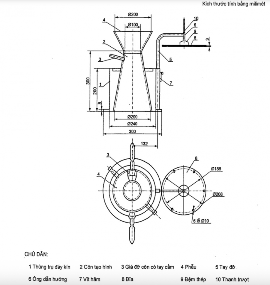 - Kích thước côn thử độ sụt: Φ100/200 x cao 300 mm